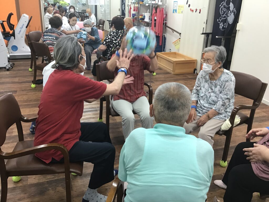 7/25(月)〜7/29(金)の1週間、夏のイベントでビーチボール渡し大会を行いました。Aチーム、Bチームに分かれてどちらのチームが速くボールを回せるか競い、先にボールを3周回せたチームの勝利!というルールでゲームを行いました。皆さま真剣に素早くボールを渡していました。勝ったチームには夏のひんやりグッズの景品がプレゼントされました。今年の夏はコロナ禍に加え猛暑で外になかなか出られませんが、SOLで少しでも夏の気分を味わっていただけたらと思います。